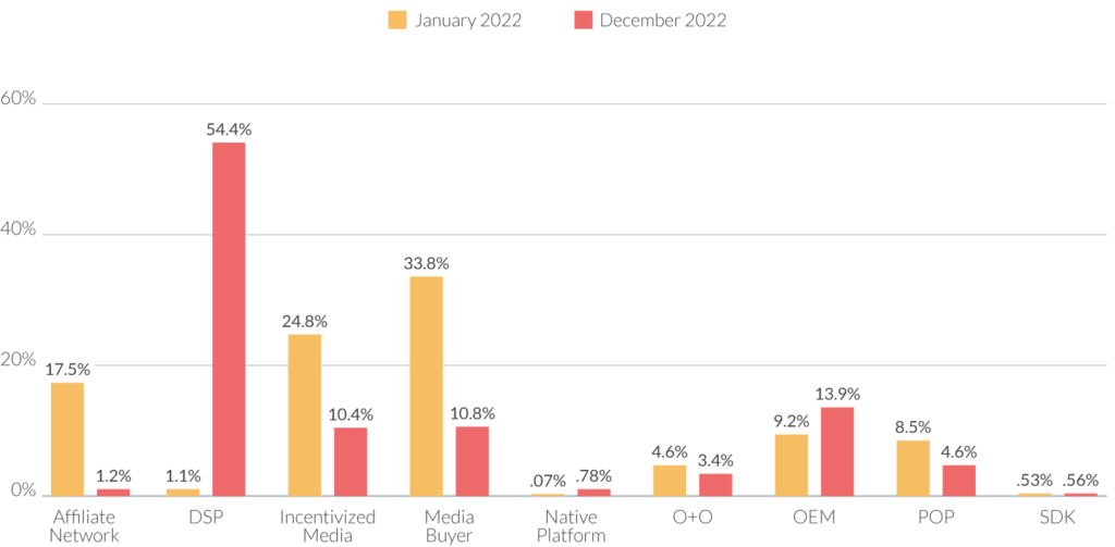 Pop and media buying partners faired well last year due to the extreme cost-effectiveness that drove value in specific client verticals. While pop ads can be viewed as intrusive, they allow for a relatively low-cost supply with high visibility and user interaction. Partners with media buying capabilities were a critical component of our supply mix offering in 2022 as they provided specialized insight into finding new sources of untapped inventory. Of course, it’s important to hire an agency that can perform due diligence on media buyers and ensure that truly high-quality users are delivered.