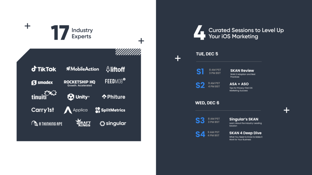That’s right, FeedMob is teaming up with Singular — and over a dozen other industry experts — to help mobile performance marketers catch up with all things SKAN during a two-day event. I will participate in the first panel, “SKAN 3 Adoption and Best Practices,” with experts from Singular, Unity, Smadex, Rocketship HQ, and A Thinking Ape.